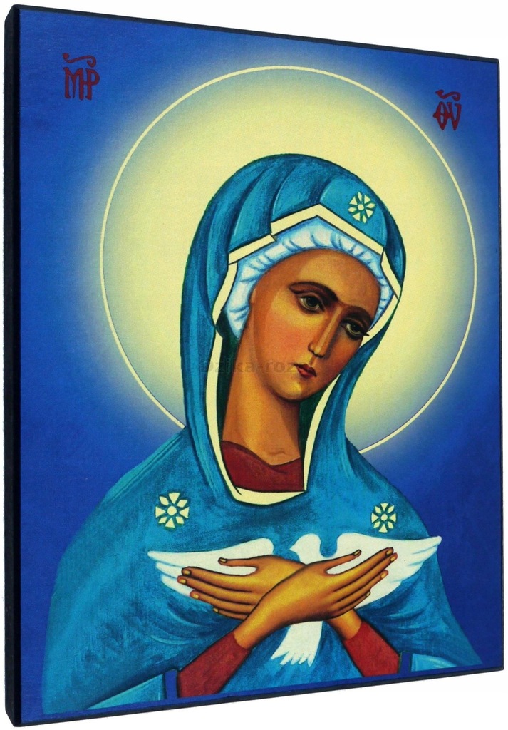 Maksymiliana kolbe, który widział w maryi autentyczną ikonę ducha świętego... Jest to reprodukcja ikony naklejona na wysokiej jakości płytę mdf. Czyli matka boża niosąca ducha świętego. W pracowni karmelu miłości miłosiernej braci trapistów z tibhirine. Ikona powstała na początku lat 80 tych xx w. Nie jest więc ikoną kanoniczną wg starego stylu.. Możliwość wykonania w innym rozmiarze chcesz zamówić ?